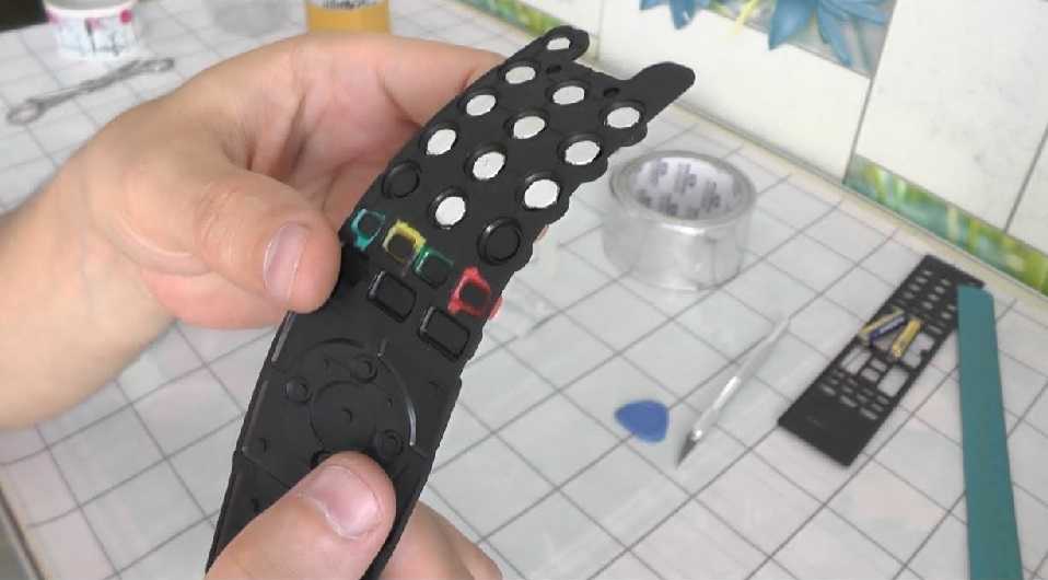 Ремонт кнопок ТВ пульта фольгой. Фольга приклеена на двухсторонний скотч