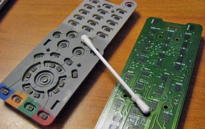 Саму плату можно чистить специальными средствами, но ни в коем случае не водой. Поскольку такой способ может стать причиной покупки нового пульта дистанционного управления. Здесь можно использовать этиловый спирт на ватной палочке или другие средства для чистки окислённых и грязных контактов. Нужно убедиться, что ни один кусочек ваты не остался на плате после чистки.