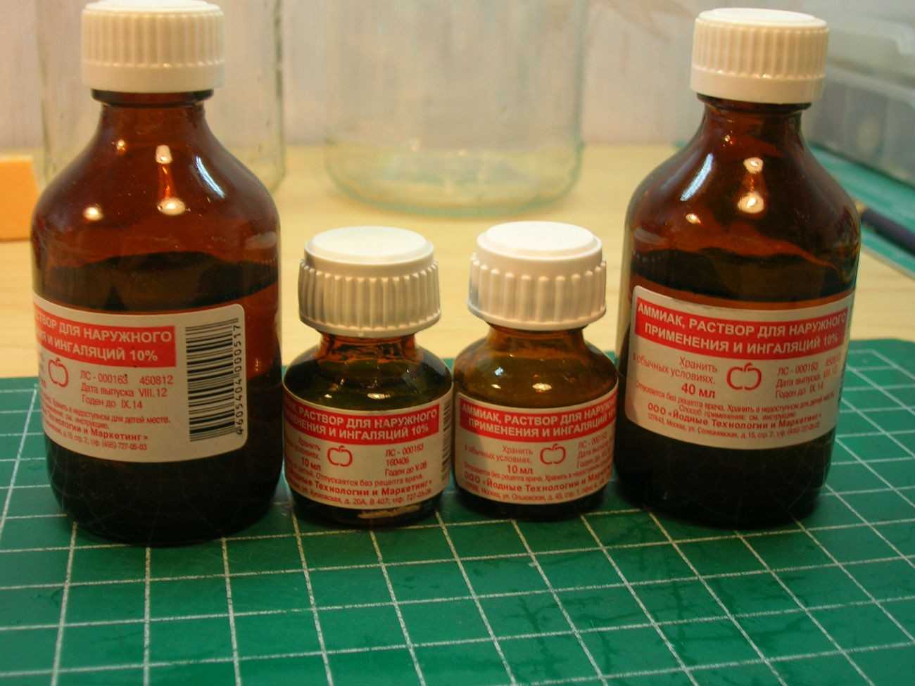 - Создать раствор, добавив в стакан воды чайную ложку нашатырного спирта.