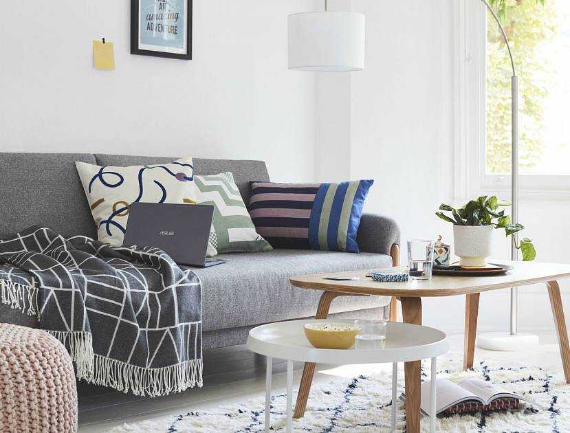 - Длинный диван можно зрительно укоротить и расширить, если уложить покрывало поперек конструкции.