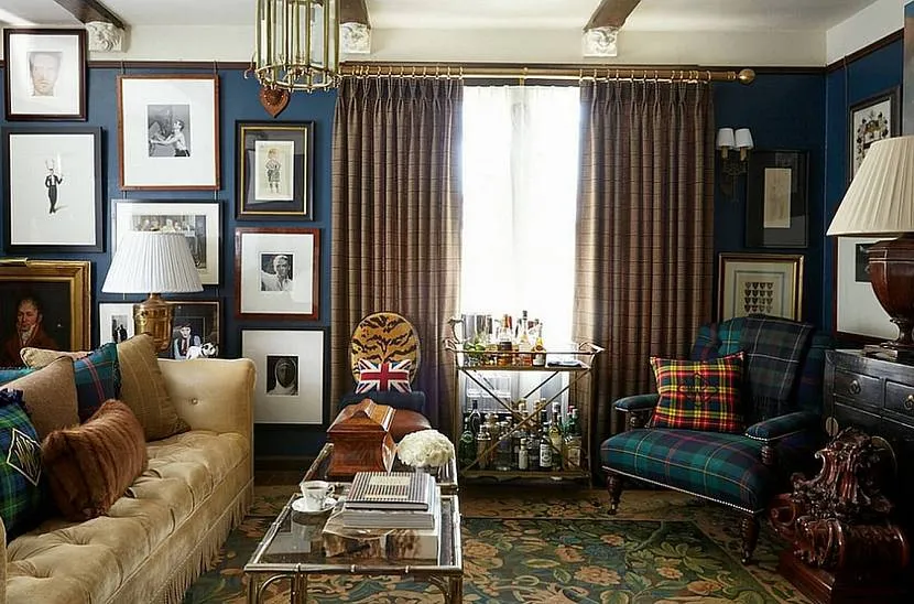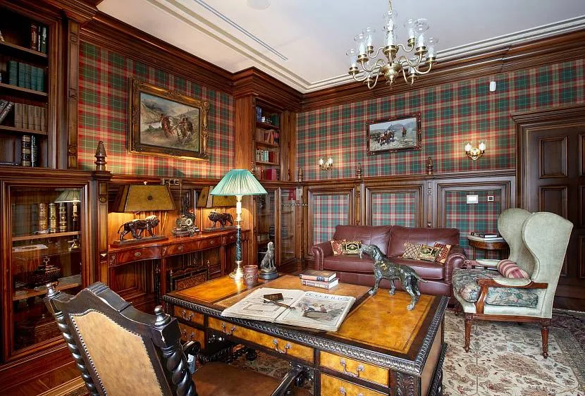 Шотландская клетка, традиционный британский рисунок или объемный цветочный принт смотрятся наиболее выигрышно. Такая расцветка эффектно дополняет мебель из натурального дерева и коричнево-бежевую гамму отделки.