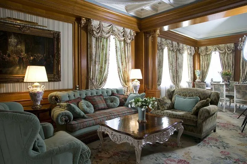 Портьеры с мягким ламбрекеном отлично вписываются в классический и барочный стиль. Они сглаживают строгость интерьера, придают ему благородный антураж, создают атмосферу торжественности.