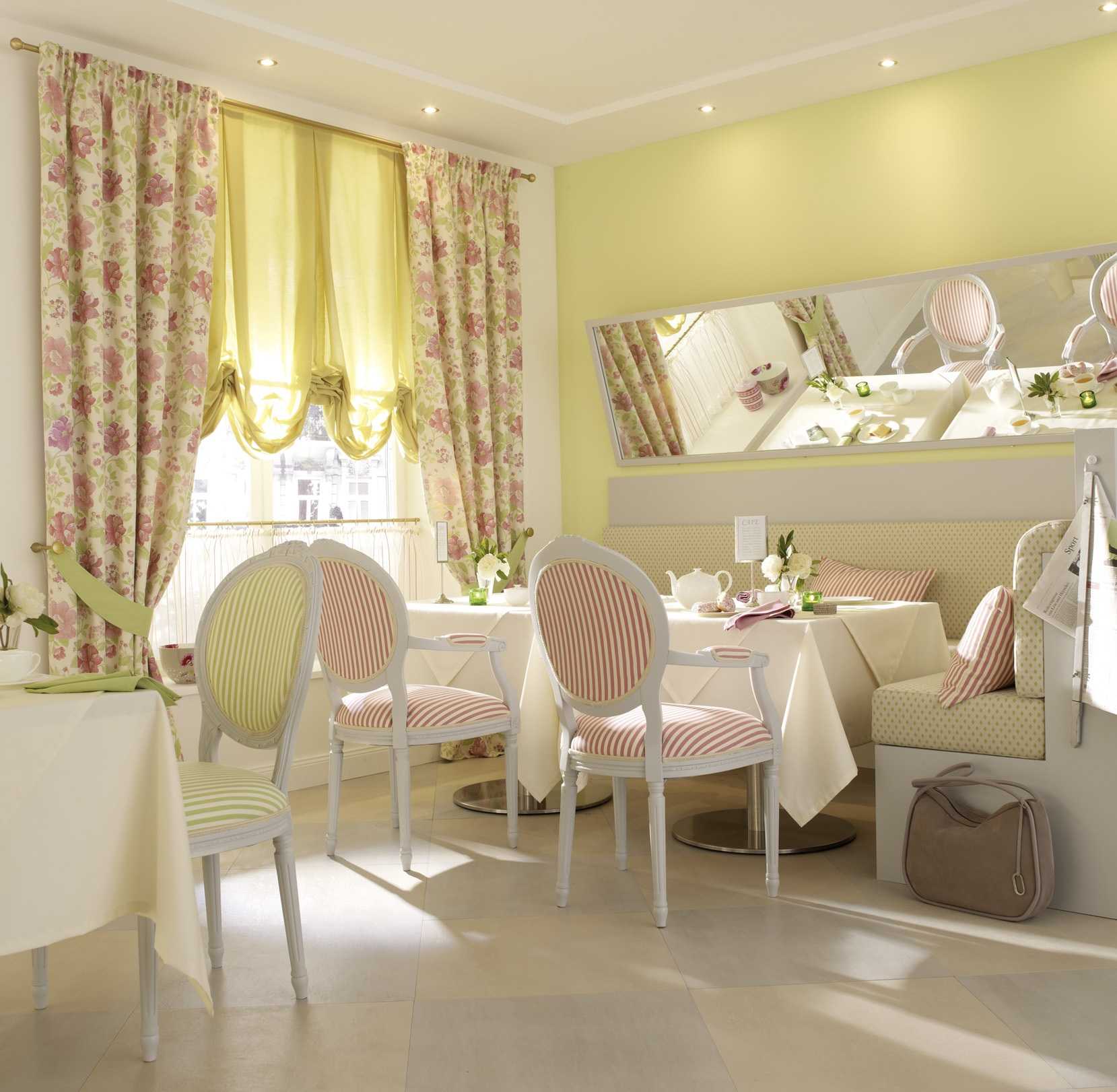 Нежная и уютная столовая благодаря светлым оливковым оттенкам стен и штор