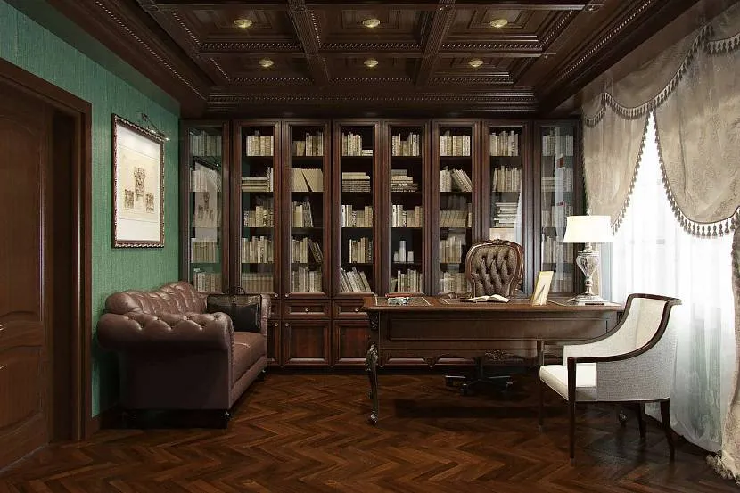 Для окна возле домашней библиотеки можно подобрать белее легкую, но темную ткань для шторы