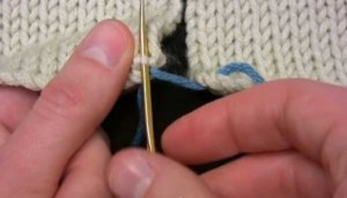 Если перед нами изнаночная вязка, то мы будем подхватывать дуги изнаночных петель, расположенных возле кромочных. Если у нас разные петельки, мы будем вводить иголку под протяжку, которая находится между кромочной петлей и соседней