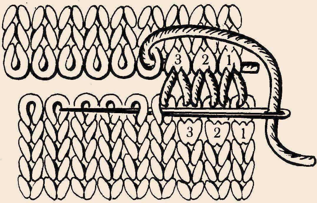 Выполняется иглой с лицевой стороны вязания. Иглу продевают попеременно то в нижнее полотно, то в верхнее, захватывая, справа налево самые верхние лицевые петли. Детали располагают симметрично одно над другим на ровной поверхности.