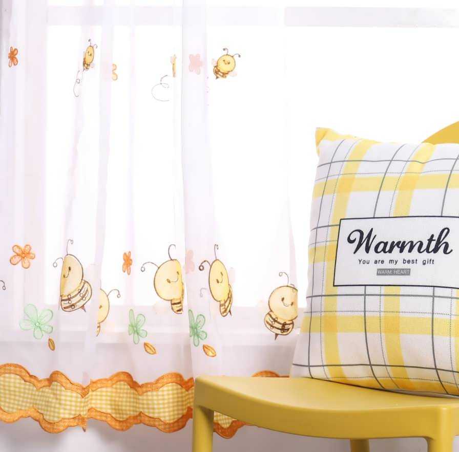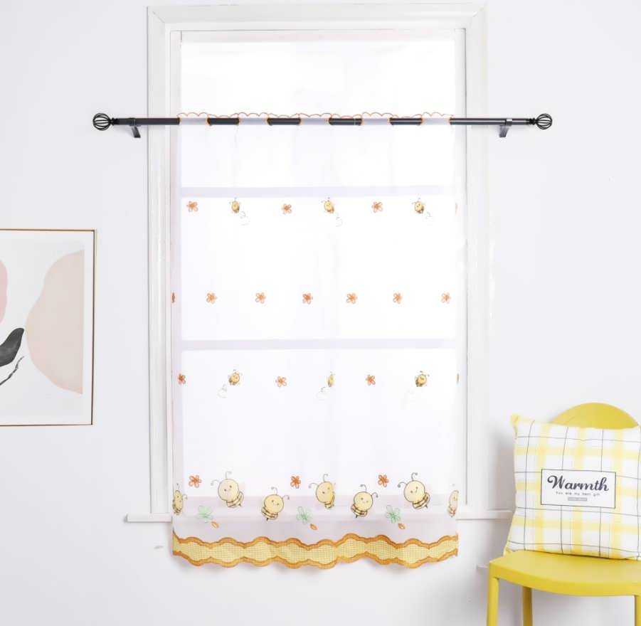 Белые тюлевые шторы с вышитыми мультяшными пчёлками идеально впишутся на кухню, где обедает большая семья с детьми. Придают интерьеру индивидуальность. Приятные жёлто-оранжевые оттенки, используемые в дизайне штор, делают помещение праздничным и солнечным. Любоваться такими занавесями доставляет одно удовольствие. Такой дизайн имеет свойство бодрить и наполнять пространство положительной энергией.