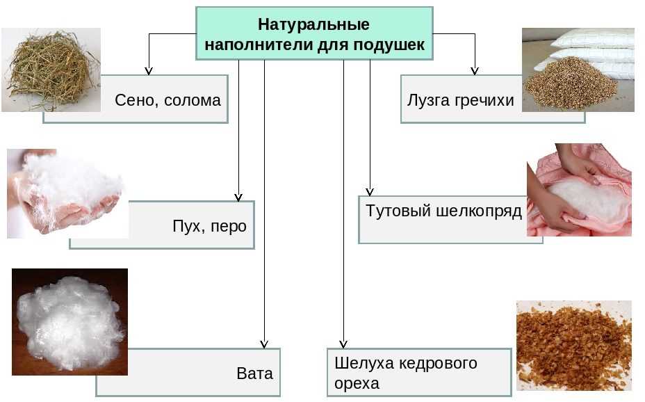 Распространенные натуральные наполнители – пух, шерсть, перья, бамбуковое волокно. Применяется шелуха гречки, сено, солома, целебные травы.