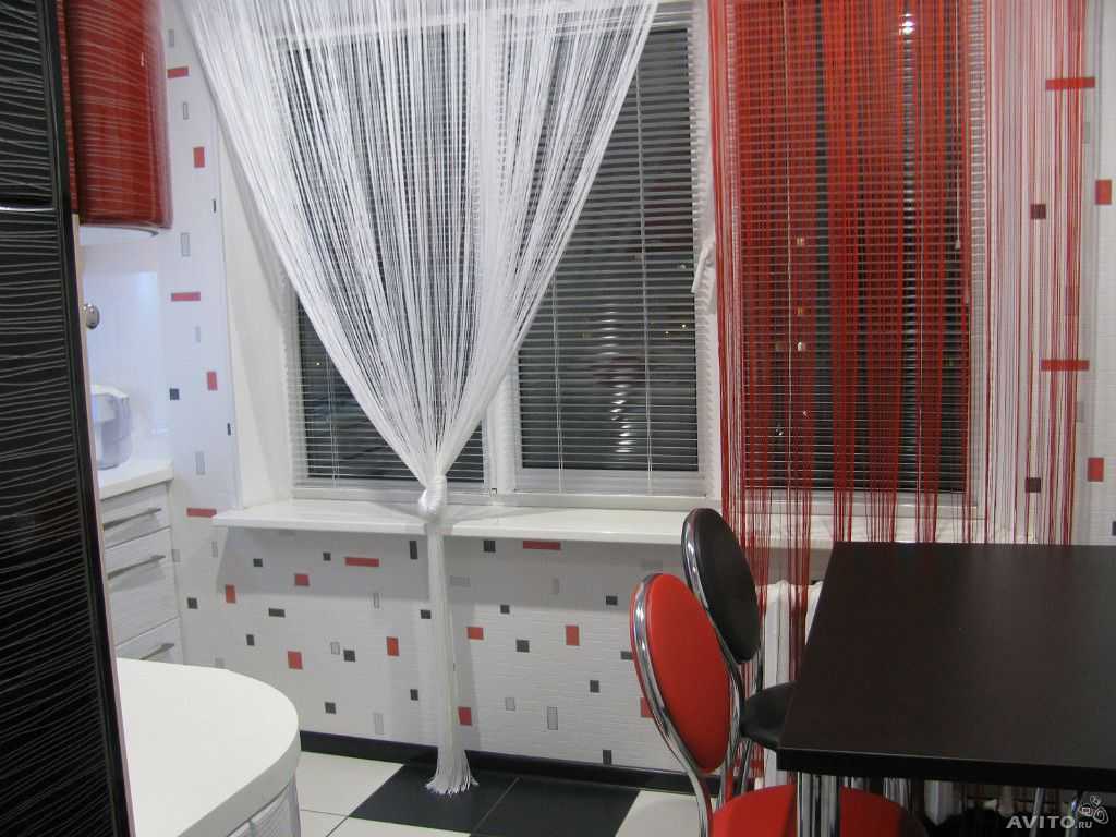 Важно! Тюль нитками плохо защищает комнату от света, поэтому для обеспечения здорового сна детям, следует использовать его только в качестве декоративного элемента. Пример интерьера для кухни