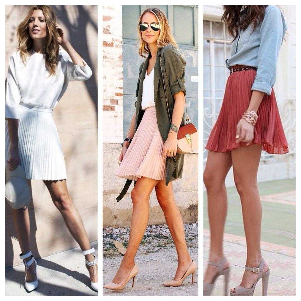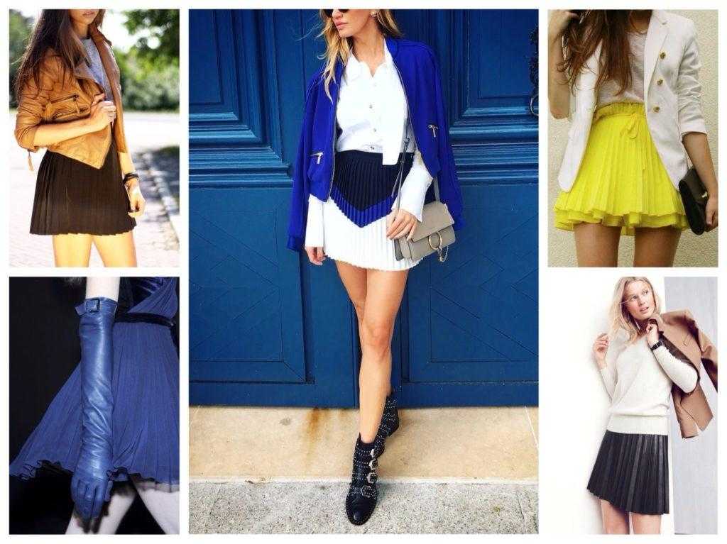 Для прогулок и романтических свиданий идеальным выбором станет короткая плиссированная юбка из легкой ткани спокойного цвета. Дополнить такую одежду можно контрастным верхом в виде свободных непрозрачных шифоновых блузок, облегающих топов и рубашек, которые можно легко заправить за пояс юбки. Гофрированная юбка, в отличие от плиссированной, является универсальной одеждой на любой случай жизни, к которой подходят очаровательные блузы с воротником-стойкой или женственными рюшами.