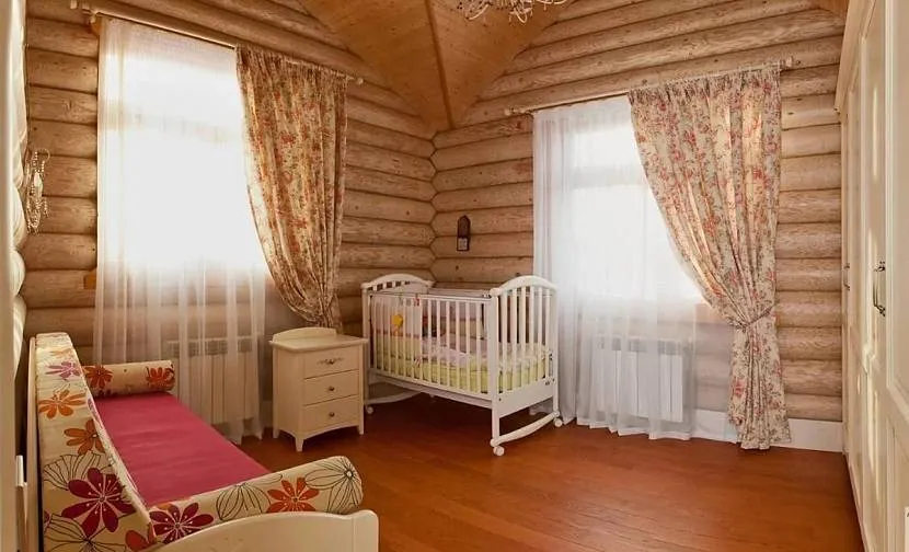 - Шторки на петлях крепятся на карниз. Они пришиваются к изнаночной стороне занавески. Неплохо смотрятся в классическом стиле интерьера в бревенчатом доме.