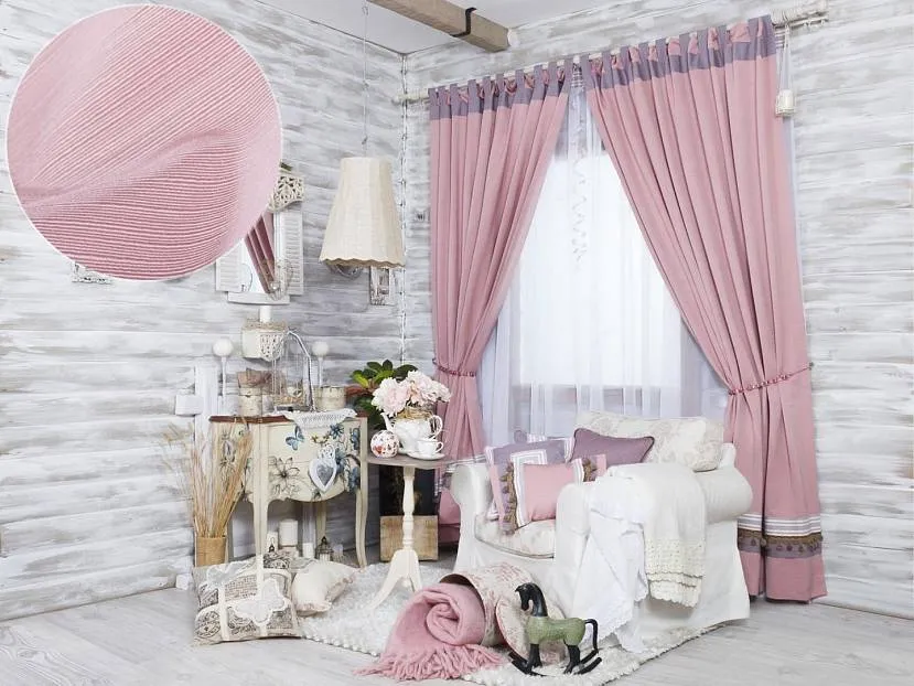 - Романтические стили. Для таких направлений, как прованс, ретро, шебби-шик подойдут крепления-завязки, оформленные с помощью тесьмы или ленты в виде бантов или узелков. Для петлевых креплений выбирают ткань нежных оттенков: розового, лилового, фисташкового, используют кружева и рюши.