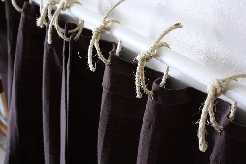 - Петли на узлах. Сшить петли на узлах для штор еще удобнее, чем остальные вариации петель. Подготовленные петли наглухо пришиваются к полотну шторы и подвязываются за карниз специальными отрезами ткани, которые продеваются в петли. Отрезы ткани должны быть длиннее петель в 2 раза, потому что будут образовывать несколько узлов при креплении к карнизу.