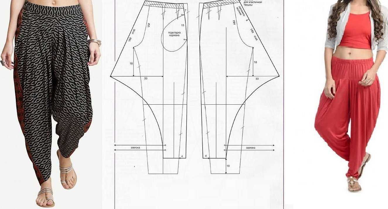 Излишнюю ткань можно застрочить или заложить в складки. Для таких фасонов подходит мягкий материал. Ширина нижней части штанов зависит от желаемой модели брюк.