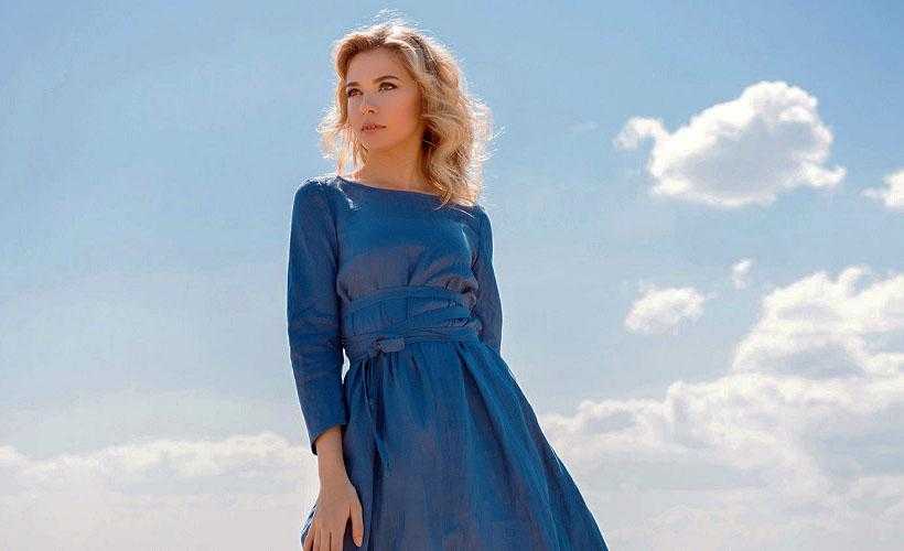 - Лен. Более плотный текстиль с высокой прочностью, износостойкостью, теплопроводностью. Последнее означает, что лен не сохраняет тепло тела. Он гигроскопичен и воздухопроницаем. Поэтому лен – идеальная ткань на платье для постоянной носки в жаркое время года. Однако сильно мнется, на ощупь несколько грубее хлопка, совершенно неэластичен. Значит, обтягивающее летнее платье лучше сшить из другой материи. К тому же, лен достаточно дорог.