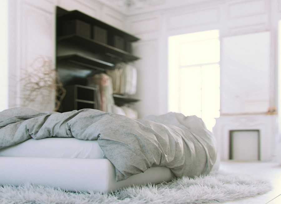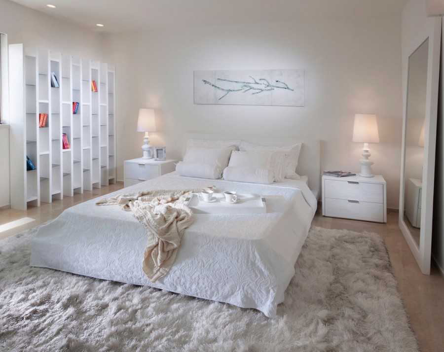 Многие любят застелить ковровым покрытием весь пол в спальне. На самом деле, один ковёр под кроватью будет выглядеть более стильно и эстетично.