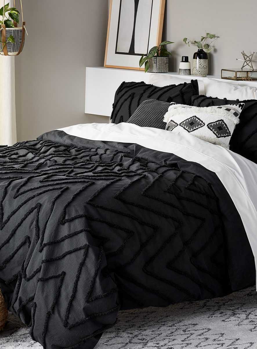 Многослойность будет выглядеть гораздо интереснее, если использовать двухстороннее постельное белье. Например, в комплект входит светлая однотонная простыня, наволочки в темных тонах, пододеяльник с контрастной изнанкой (с узором или принтом).