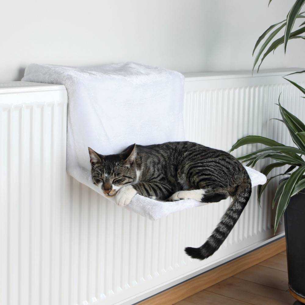 Весьма оригинально смотрится лежанка для кошки на батарее. В этом случае кот отдыхает и в то же время греется, потому что такая подвесная подстилка контактирует непосредственно с батареей. Подобный подвесной вариант довольно актуален в осенне-зимний период, делая жизнь питомца еще более комфортабельной. Еще один интересный вариант – гамак. Но такая лежанка не каждому животному может прийтись по душе.