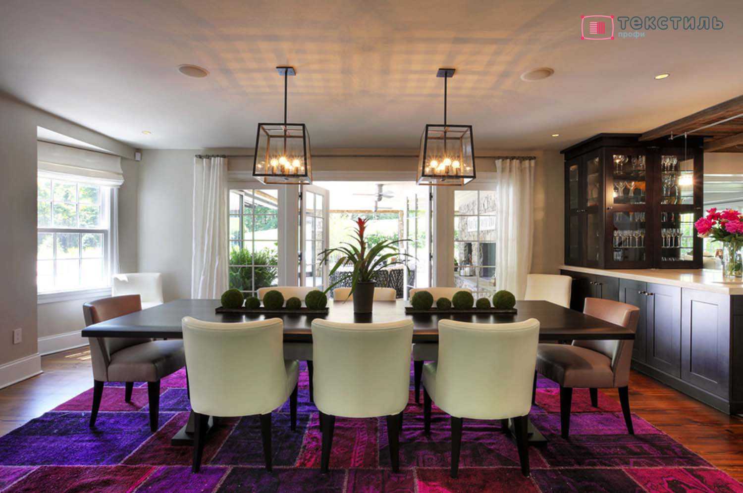 - Цвет ковра в тон интерьера. Если в помещении имеются цветные элементы, то цвет ковра можно подобрать под них. К примеру, ковер может соответствовать обоям, цвету скатерти, стены, потолка, кресел, стульев и тому подобное.