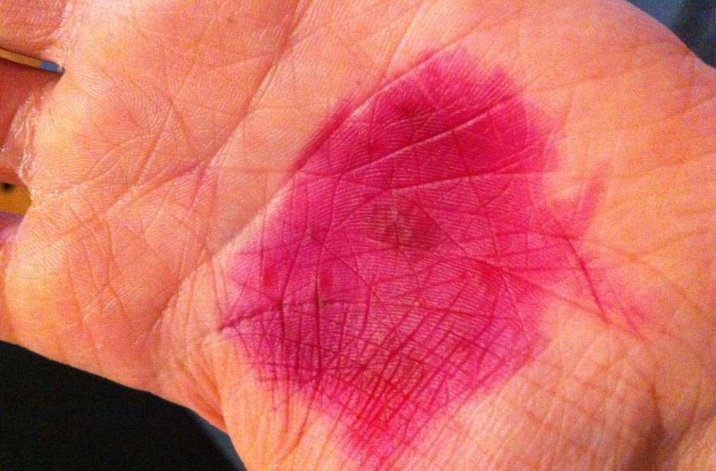 - Спустя несколько минут пятно от фукорцина начнет бледнеть. Сильно тереть не нужно, так как на этом месте может остаться покраснение.
