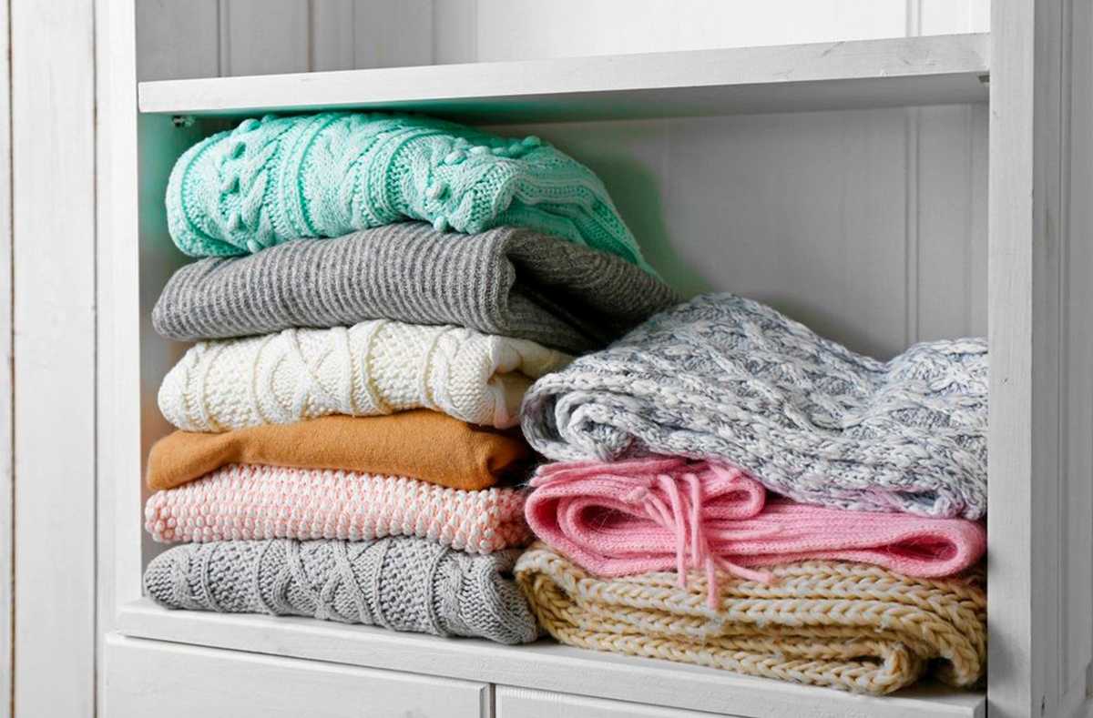 Важно, чтобы все вещи были на виду, не перекрывали друг друга. Пушистые свитера с длинными ворсинками надо укладывать сверху, чтобы они не деформировались под другой одеждой.. Коробки, кофры, корзины — послужат, когда с наступлением теплого сезона надо убрать трикотажные и шерстяные вещи на дальнюю полку
