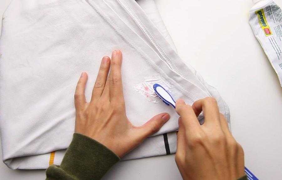 Для удаления свежих пятен гуаши можно использовать зубную пасту, нанесенную на проблемное место. Спустя 5 минут краска уже будет удалена. Этот метод является самым доступным при отсутствии подходящих средств.