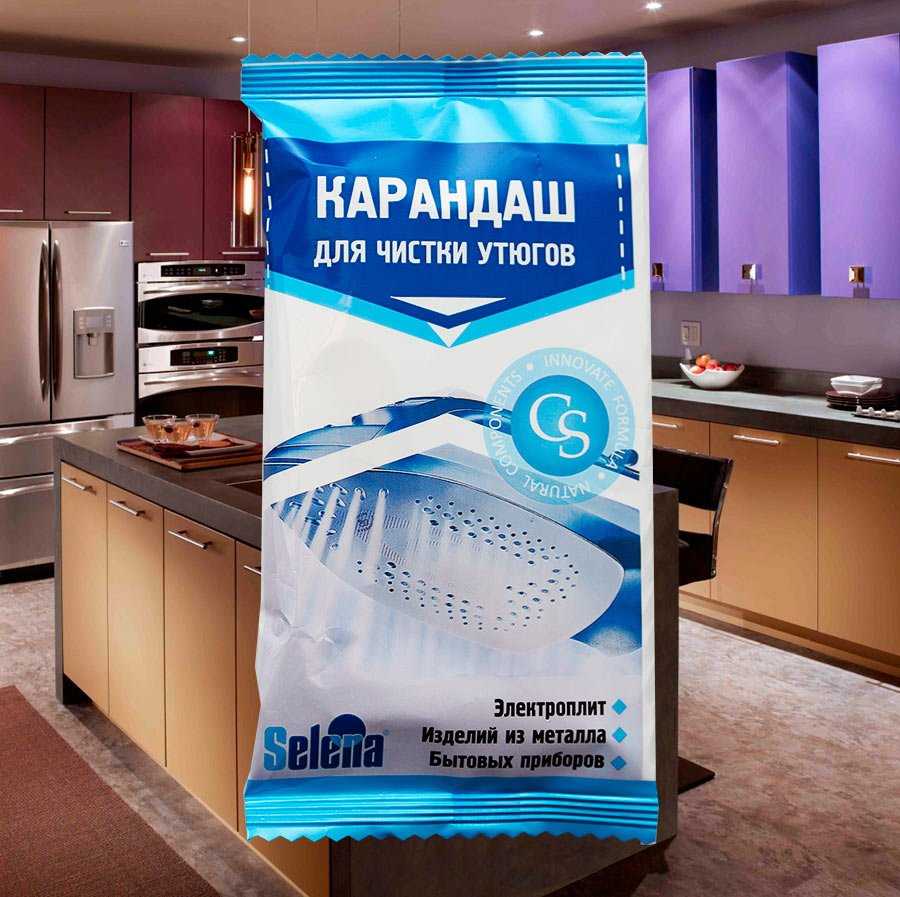 Самое распространенное средство — чистящий карандаш с кислотами или нашатырным спиртом. Приобрести его можно в любом хозяйственном магазине или фирме, где был приобретен утюг. Прибор нужно установить вертикально и нагреть до +130…+200°C. Провести карандашом по подошве без сильного нажима. Средство начинает плавиться и снимает подгоревший налет.
