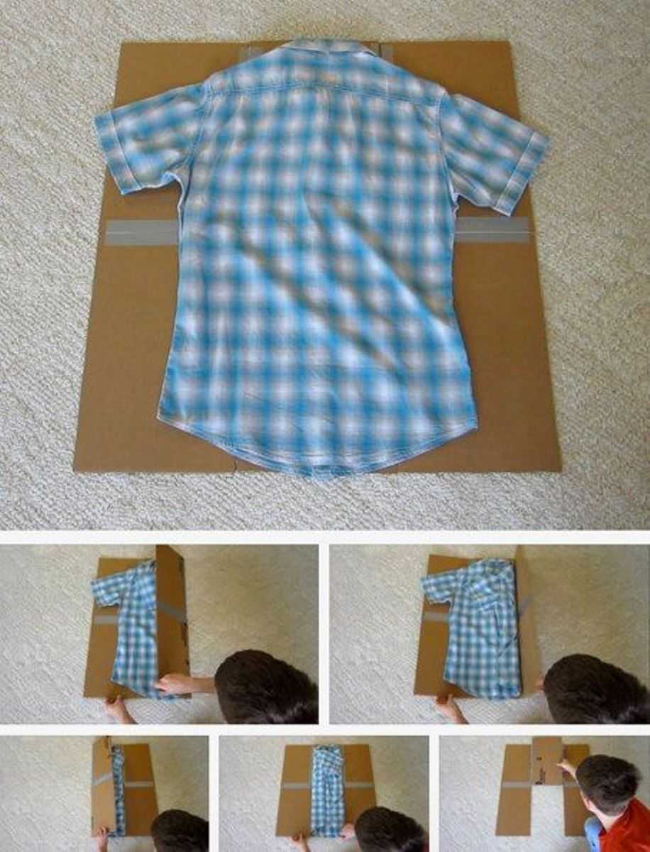 Этот метод позволяет быстро и аккуратно сложить рубашку. Для него понадобится прямоугольный кусок картона, лист А4 или планшет для бумаги. Процесс складывания выглядит следующим образом: