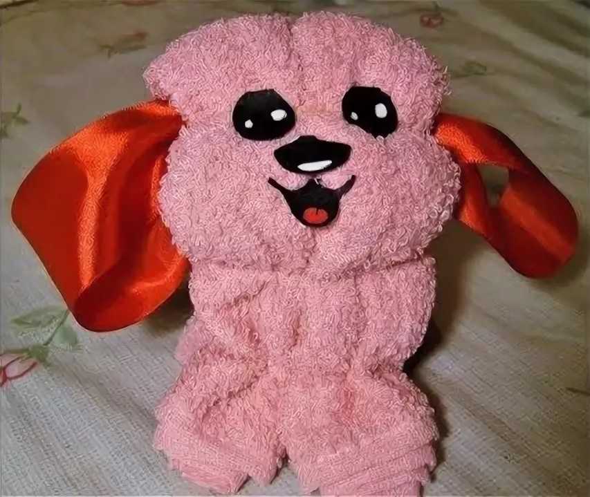 Красивые поделки из полотенец можно делать не только своими руками. Пригласите ребенка, чтобы тот сделал сам себе красивую и мягкую игрушку, сделанную из полотенца любимого цвета. Из материалов возьмите само полотенце, ленту, декоративные глаза и нос, а также три резинки, которыми заворачивают деньги.