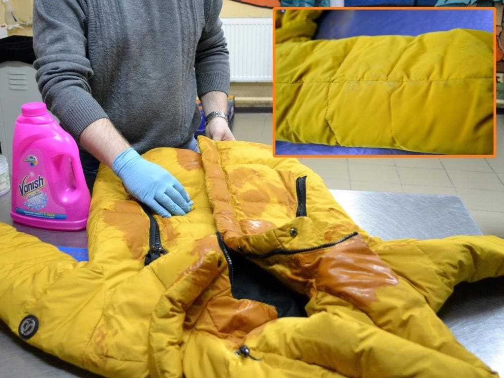 - Исследуйте зимнюю куртку на наличие пятен и сильных загрязнений. Застирайте их хозяйственным мылом.