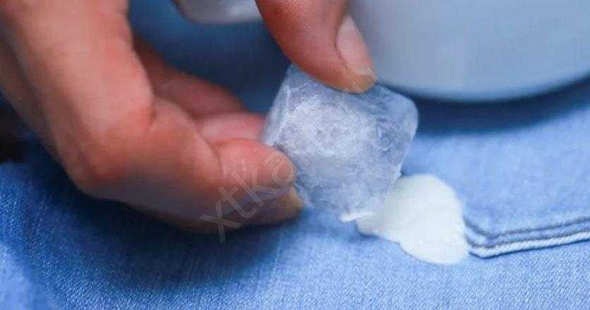 На большом изделии, которое никак не помещается в морозилку, жвачку можно заморозить кубиком льда. Сперва его необходимо вложить в пластиковый пакет, который предотвратит попадание талой воды на ткань.
