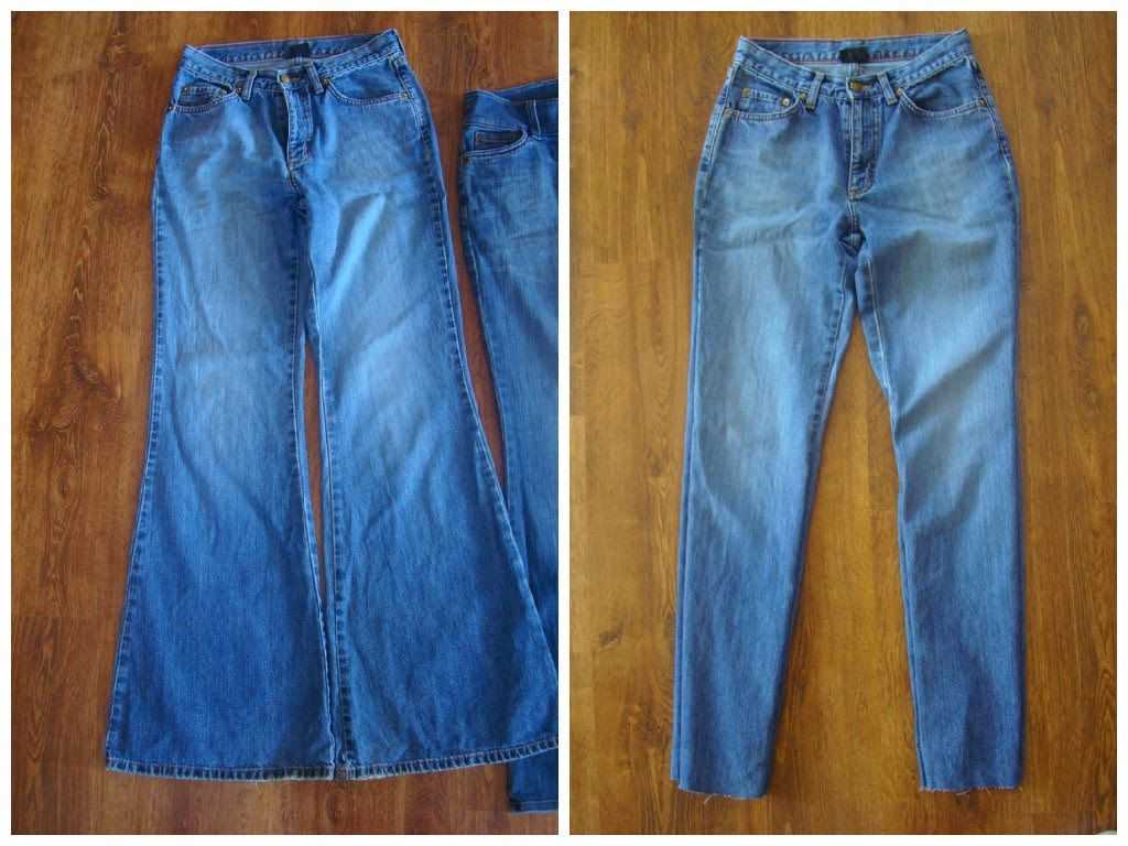 Распороть их по внутреннему шву и снизу (длину распоротого шва будет определять степень зауживания, у джинсов клеш можно убрать шов максимум до колена).