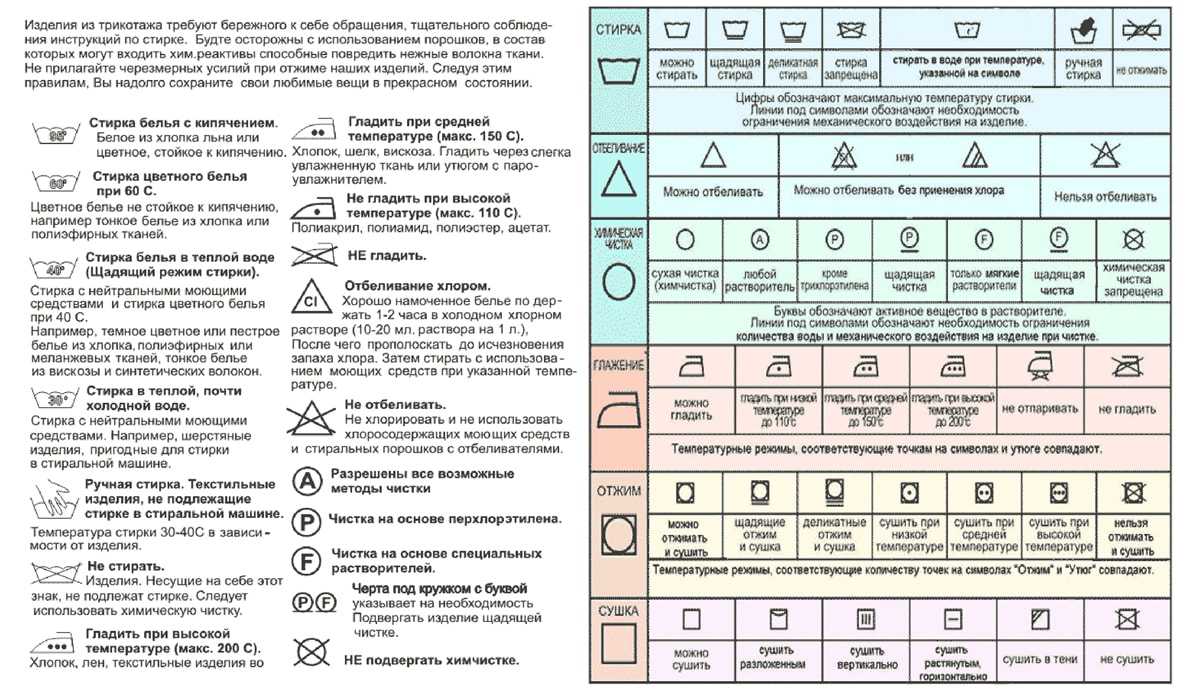 Понимая значение символов, можно правильно подобрать режим стирки, температуру глажки и определить возможность проведения химической чистки или отбеливания.